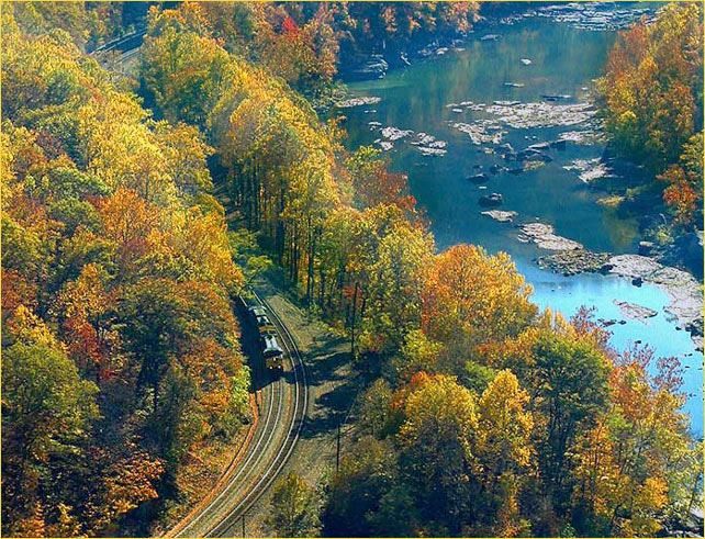 A coal train rolls along the valley beside the New River near Hawk's Nest State Park in Fayette County , West Virginia.